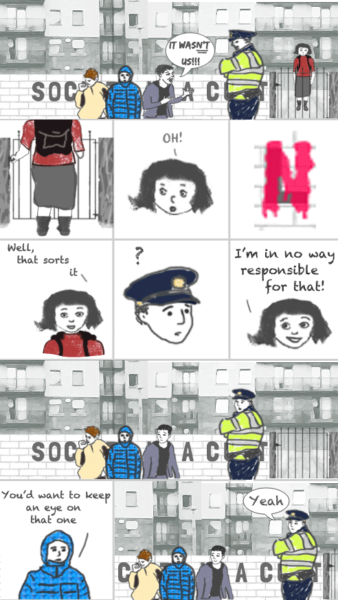twimii is walking out of her apartment. There is a garda (police officer) outside her gate taking to three boys. One of the boys is saying angrily 'It wasnt us!!!'. twimii is closing the gate behind her, she looks at the wall and gasps 'OH!'. The L has been changed to an N. twimii happily says to herself 'well, that sorts it'. The garda turns around and looks at her puzzled. She looks up at him and says delightedly 'I am in no way responsible for that!'. She then walks off on her way. The garda and the three boys stare after her in amazement. One of the boys then says to the garda 'You'd want to keep an eye on that one' The garda's eyes narrow as he watches twimii and he says 'Yeah'.